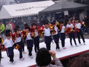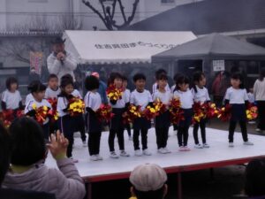 わいわいフェスタ 2025/12/27 12月14日(日)に初めて4歳児が呉田地区のわいわいフェスタに出演させていただきました。大好きな『赤鼻のトナカイ』の歌に合わせて踊りました。子どもたちは、「ポンポンがキラキラでかわいい!」「いつなの~?」と心待ちにする姿もありました。 初めて大勢の方の前で披露することに「緊張するね」「ドキドキするね」と友だちや保育者に話す様子もありましたが、出番が終わると「楽しかった!」「見てもらえて良かった」と達成感にあふれていた様子は可愛らしかったです。
