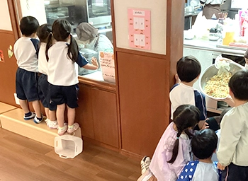キッチンはガラス張りで、子どもたちは毎日保育士と一緒に、「今日の給食何かな?」と、調理している様子をのぞきに来ます。保育室の近くに厨房があることで、子どもたちはおいしそうな匂いに包まれながら、食に関する興味や意欲を育んでいきます。