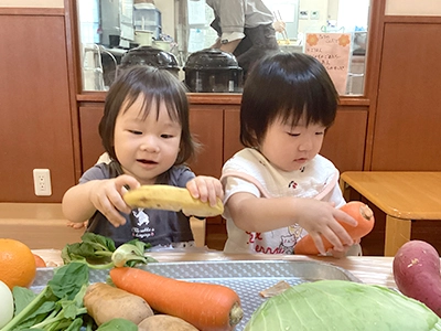 調理される前の食材を子どもたちに見せて、給食にはどんな野菜が入っているのかを見てもらったり、乳児では少しでも野菜に親しみが持てるように、野菜スタンプを行ったりしています。