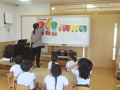 幼児になると、「なぜ食べるのか?」「苦手なものも食べるのか」などについて三食食品群を用い、食事が自分たちの体を作ることを、子どもたちが「食」に興味を持ってもらえるように楽しく伝えています。