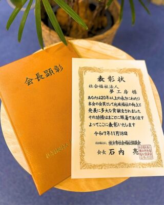 横浜市社会福祉協議会より「会長顕彰」を受賞しました! 2025.11.26 このたび社会福祉法人夢工房は、横浜市社会福祉協議会より、長年にわたり地域福祉の向上に寄与した法人として 「会長顕彰」 を受賞いたしました。 当法人は20年以上にわたり、地域に根ざした保育・福祉活動に取り組んでまいりました。 今回の受賞は、日頃よりご支援くださる皆さまのおかげであり、心より感謝申し上げます。 これからも、子どもたち一人ひとりの成長を支え、地域とともに歩む法人として、より良い保育と福祉の実現に努めてまいります。 引き続き、社会福祉法人夢工房をどうぞよろしくお願い申し上げます。